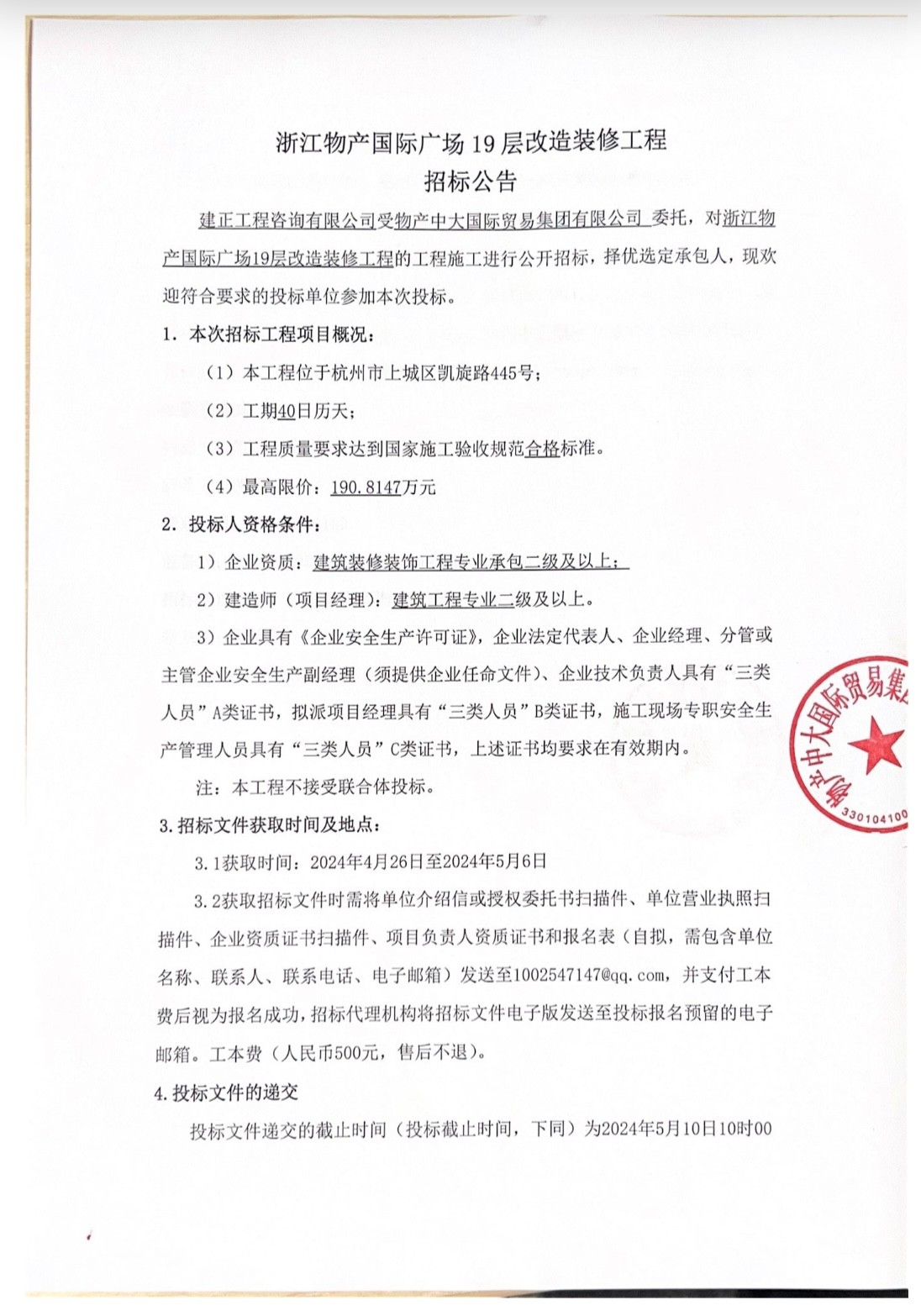 浙江凯发一触即发国际广场19层革新装修工程招标通告