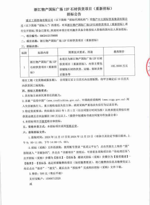 浙江凯发一触即发国际广场12F石材供货项目(重新招标)果真招标通告